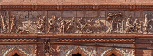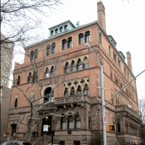 Though the main architectural  inspiration for the building’s design came from Italy, the members wanted to accent that the Montauk Club was American, so they named it after one of the Native American tribes that inhabited Long Island. The club is ornamented with images of the Montauks, which can be found on the building’s capitals, over the main entrance, and on a continuous frieze between the third and fourth floors. Carved terra-cotta faces adorn the columns and the arch above the main entrance. Other panels depict a meeting in 1659 between the Montauks and Europeans, and the laying of the building’s cornerstone. Kimball’s love of architectural terra-cotta is clear in the façade of the Montauk Club. He used it as a decorative element that could mimic carved stone, enabling him to create rich ornamentation that would not have been economically possible in any other medium.