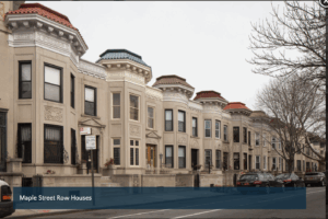 Yesterday I posted about the cute row houses near the Pratt campus. They were built in 1907. Today I am going to dedicate the blog to a different set of row houses in Lefferts Garden. The row houses featured in today’s blog line Maple Street between Bedford and Rogers Avenues. I know this street well because I used to live on Lincoln Road just behind Maple Street. Until 1893 this was the farmland of the Lefferts family, but especially after the building of the Brooklyn Bridge, the area began its transformation into a residential area. Lefferts divided his farm up into lots, but he did not want apartment buildings so each lot has a covenant restricting it to two family homes. In 1909 a Swede, Alex Hedman built these stunning row houses on Maple Street. Built of limestone in the Neo-Renaissance style, the two family homes have Spanish tiled roofs. They have really large interiors and a luxury in new York City, back gardens. Gas lamps, which were once ubiquitous in Brooklyn, stand in front of each house. The elegant interiors have mahogany and cherry wood. There is a beautiful symetry to these row houses that attracts the eye. In the 1960s and 1970s whites fled the area and it became African American and Caribbean American. in the 70s, you could buy one of these houses really cheaply, but today they probably fetch three million. Thankfully, the area is landmarked.